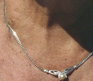 Collier ras-de-cou élégant argenté orné de brillants et d'une perle Très élégant et aux reflets bien brillants. Design et dimensions : Déplié, le collier fait 42 cm de long