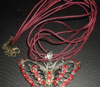 Très beau Collier Papillon. NEUF. Papillon couleur argent avec brillants rouges. Longueur: 6,7cm, largeur: 4cm, poids: 27grammes. D'autres modèles sur le thème Papillon, n'hési