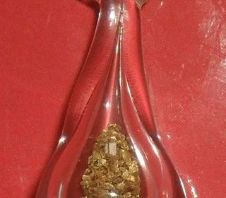 Très joli et original Pendentif en verre avec paillettes d'Or à l'intérieur. Etat NEUF. hauteur 3cm. Poids: 1gramme. D'autres lots de boucles d'oreilles, broches, colliers, pen
