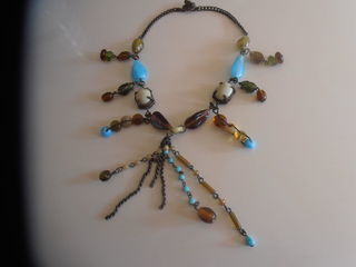 Très joli coller, avec chaine en métal vieilli, agrémenté d'une multitude de pendentifs composés de pierres, de perles et de chainettes, dimensions : 44 cm x 10 cm. Excellen