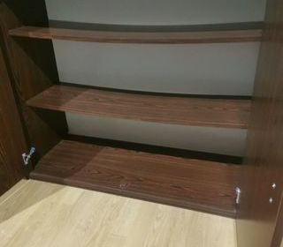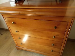 chambre à coucher merisier, lit 160/200 + sommier à lattes armoire portes coulissantes un côté penderie une commode 2 tables de nuit 2 tiroirs sous le lit à démonter ( p
