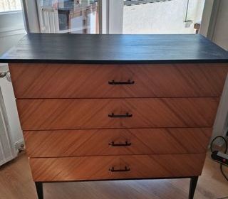 Joli meuble commode en bon état général. Les tiroirs sont très propres et capitonnés. Il y a juste 2 très légères auréoles sur le dessus. Largeur 58 cm - Profondeur 40 cm - Haut
