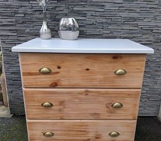 Commode en bois pin massif avec trois tiroirs et poignées métalliques. Dimensions : Longueur 80 cm Hauteur 86 cm Profondeur 49cm