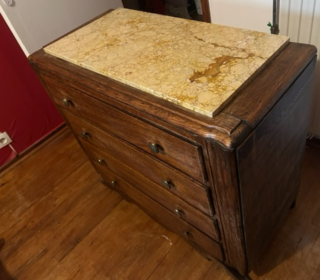 Commode 4 tiroirs avec plateau marbre Commode ancienne en chêne (années +-1950 ) marbre dimension 80*39 et hauteur 1,50 cm meuble dimension hors tiroirs et sans débords pieds di