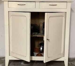 Je suis dans la maison depuis1921? bois de sapin peint, deux portes une etagere etdeux grandst iroirs. Tout est correct malgre mon grand age dimensions:130/45/95