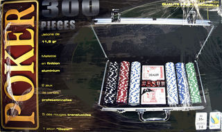 70) Jeux de Poker en malette Alu, L 40cm, largeur 23,5cm, ép 7cm. 300 véritables jetons de Poker de 11,5 grammes, 100 blanc, 50 Rouge, 50 Bleus, 50 Noir 50 Verts, 2 sets de jeux
