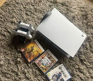 Je mets en vente ma PlayStation 5, encore sous garantie et en excellent état, avec 4 jeux récents, ( fifa 25 fifa 23 , mortal kombat , Gta V )2 manettes DualSense, le carton d'orig