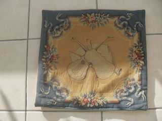 Belle housse de coussin Jules Pansu - 47 cm de côté - tour fleurs et noeuds anciens - centre instruments de musique - fermeture à glissière - article neuf de fabrication française