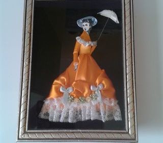 A vendre très joli cadre doré avec belle dame habillée de tissu , dentelle, rubans sous verre. Sa robe est orange en satin avec des rubans bleus, dentelle blanche et guirlande de