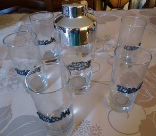 6 verres à whisky ( hauteur 14.5 cm ) et shaker à cocktails ( hauteur21.5 cm ) en très bon état A retirer sur place : Frans ou environs PAS D'ENVOI - REGLEMENT EN ESPECES