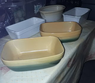 Lot de terrines en céramique de différentes formes et couleurs, comprenant des plats ovales et rectangulaires. Idéal pour la cuisson des pates ou autre peut être vendu à l'unité r