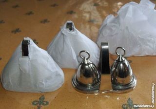 3 ménagères sel et poivre en métal inox brillant deux petites cloches dessous en couvercle en plastique neuf ,encore emballés dimension 7 x 4 cm l'ensemble de 3 pièces 18