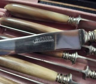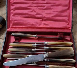 Coffret contenant un ensemble de couteaux à manche corne et lame métallique, présentés dans un écrin rigide doublé de tissu rouge. Plusieurs couteaux sont inclus dans le coffret.