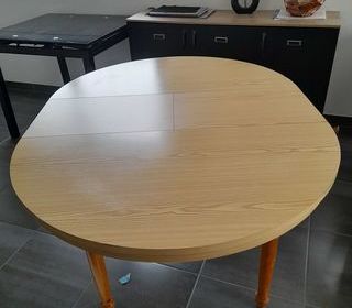 Table ronde cuisine avec rallonge en bon état couleur beige fermé 1,08 ouverte avec rallonge 1,34 H 0,75