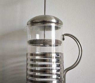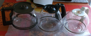 Trois verseuses (pots) en verre pour cafetière électrique. Une cylindriques (environ 12,5 cm de haut), Deux en forme de "goutte", (environ 12,5 cm et 11,5 cm de haut). A un ou d