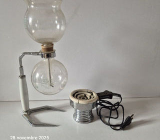 Très belle cafetière Hellem en verre Pyrex, support métal et porcelaine. Avec le réchaud électrique 220 volt et son cable , il peut être remplacé par un s