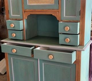 Buffet 2 pieces relooke'e entièrement, cannage sur la porte centrale haute, boutons neufs, pieds neufs, intérieur refait également, peinture bi-ton ,vert et gris , et vernis bois