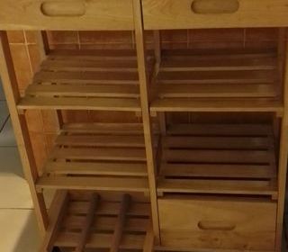 Meuble de rangement en bois avec deux tiroirs, plusieurs étagères ajourées, un emplacement coulissant pour bouteilles, et un grand tiroir en bas. Le meuble repose sur des roulettes