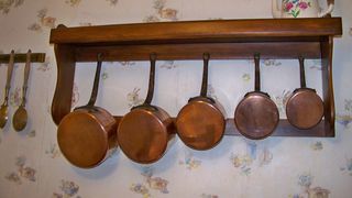 5 casseroles cuivre intéreir étamé état neuf avecconsole bois
