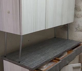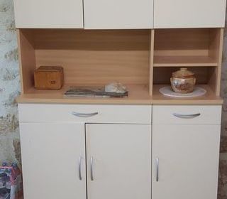 Vaisselier en 2 parties. Partie basse : long 1200mm. Prof: 500mm. Haut: 850mm. 3 tiroirs supérieur, 3 portes 1 étagère. Partie haute : long 1200mm Prof: 350mm. Haut: 1060mm