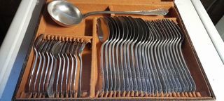 Ménagère en métal argenté. Complète - 12 cuillères à soupe - 12 fourchettes - 12 petites cuillères et 1 louche. Bon état A prendre sur place - Paiement en espèces uniquement