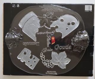 Plateau à fromage en verre Walther GLAS avec motifs en relief représentant différents types de fromage et noms en relief du BRIE, GOUDA, MOZZARELLA, GRUYÈRE et des grappes de raisi