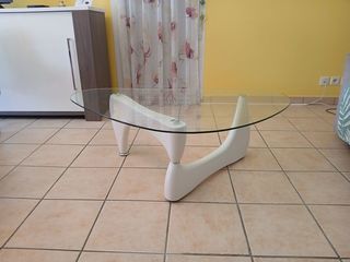 table basse plateau en verre de forme moderne avec pieds en resine blanc
