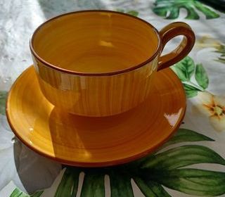 tasses en céramique de couleur jaune avec bordure marron, avec sous-tasse, très bonne qualité et bonne contenance. fait main. idéale pour un déjeuner en tête à tête. bonne affair