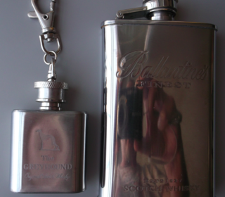 Deux flasques à whisky. - La grande, Ballantine's, contenance 3,5 OZ=9,5 centilitres. - La petite, The Greyhound, contenance 1 OZ=3 centilitres. Les deux sont neuves, jamais uti