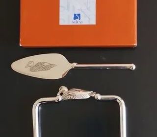 Ensemble composé d'une pelle et d'une trancheuse à foie gras, tous deux avec poignées décoratives en forme de canard. Marque SILEA.