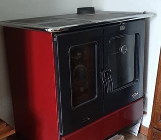 Cuisinière à bois de marque Godin armonnie noire et rouge, 6,5kw