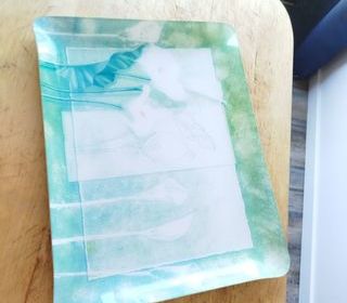 Plateau plastique avec un effet laqué très élégant. Visuel floral (lys) pastel vert /blanc très doux. - Type de produit : Plateau - Catégorie : Accessoire de table - Matière : P