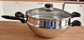 NEUF. WOK avec panier vapeur. Inox. NEUF - WOK avec panier vapeur. - Inox. - Cuve inox - Panier vapeur inox - Couvercle verre - Diamètre: 32 cm Hauteur: 20 cm - Valeur bo
