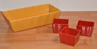 NEUF. Moule en céramique. 25 cm avec 4 coupelles 7 cm. NEUF - Moule céramique. - Jaune - Dimensions moule: 25.6 cm x 12.7 cm. H: 7.5 cm - Céramique - 4 coupelles rouges -