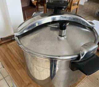 Cocotte-minute en inox avec poignées noires et système de fermeture sécurisé. Le couvercle est équipé d'une soupape de sécurité et d'une poignée centrale.en très bon état cause dém
