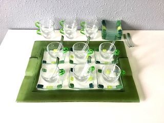 Service à café en verre Tasses diamètre 6 cm, hauteur 5,2cm Sous-tasses carrées 8,8cm Bâtonnets longueur 9,3cm Plateau 39cm x 29,5cm Lot de 6 tasses + 6 sous-t