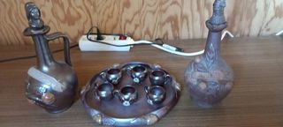 service à calvados avec plateau + 6petites tasses avec de pichets avec bouchons un de femme, un d'homme en terre cuite