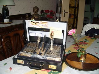 Vends ménagère " Solingen" dorée 24 carats d'or et malgré cela - lavable en lave-vaiselle ..... 78 pièces :! Ménagère encore dans l'emballage d'origine dans valise en cuir v