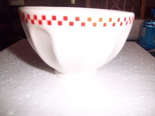 Ensemble petit déjeuners crème à petits carrés rouges comprenant 4 bols (9,50cmx6,30cm hauteur)+ 1 beurrier+1 sucrier+ 1 pot à lait prix : 5,75€ envoi possible