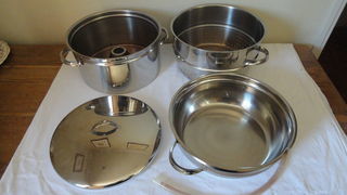 Extracteur en acier de marque Hackman à multi fonctions : extracteur de jus, diamètre 28 cm ; grosse marmite ; grand cuiseur à étages. Aspect extérieur poli brillant. Comprend 1 co