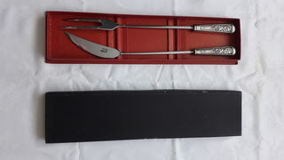 "Très bel ensemble fourche et couteau à asado avec poignées argent et or années 60 Fabrication argentine Industria Juca Dans sa boite d'origine"