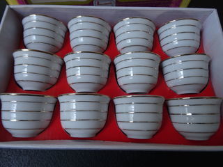 Set de 12 tasses à café saoudiennes, en porcelaine blanche, avec liseré doré. Neuves, n'ont jamais servi. Peuvent servir de verrines, contenance 5 cl. Dans leur boîte d'origine.