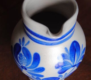 Bonjour, je vends mon pichet alsacien/allemand de grès émaillé au sel. Bleu cobalt sur fond gris du plus bel effet feront merveille sur votre table ! En très bel état 18cm de