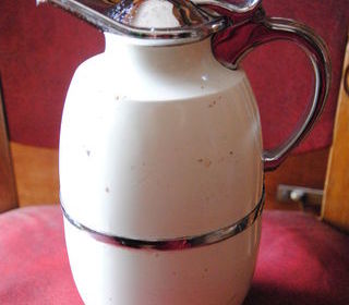 Bonjour, je vends mon magnifique et très rare thermos de la marque 'Peacock' des années 50/60, double paroi avec ampoule en verre et bouchon avec son caoutchouc. Le tout entièrem
