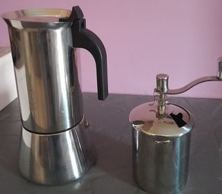 -Cafetière à l' Italienne marque : BIALETTI H ; 24 CM - 3 tasses _ Inox. -Petit moulin Manuel à grains marque : STELLAR H : 18 CM -Inox Peut convenir au camping. À RETIRER SU