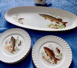 SERVICE A POISSON comprenant : 1 grand plat + saucier 12 assiettes décorées avec motifs variés A prendre sur place - Règlement en espèces