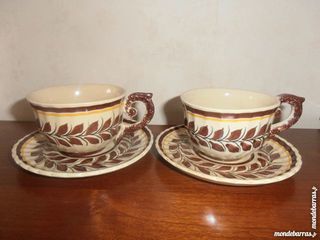 Ensemble de 2 tasses + soucoupes de la faïencerie HENRIOT QUIMPER, marque originale, signés sur le dessous, hauteur des tasses : 6 cm, diamètre 8,5 cm, diamètre soucoupes 1