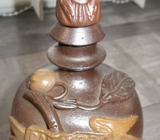 Bouteille en grès de Calvados vide avec son bouchon en tête de normand. 0,25L, 22 cm de hauteur.