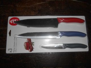 VENDS SET DE 3 COUTEAUX NEUF LAME ACIER INOXYDABLE ET MANCHE COULEUR 1 LONGUEUR 35 CM dont 21 cm de LAME ( Chef) 1 LONGUEUR 32 CM DONT 18 CM DE LAME ( cuisine) 1 LON