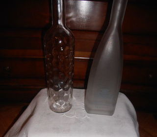 Lot de 2 bouteilles en verre, bouchons en verre, l'une style nid d'abeille, dimensions : hauteur 33 cm, diamètre 7 cm. l'autre avec l'inscription PUECH dimensions : haute